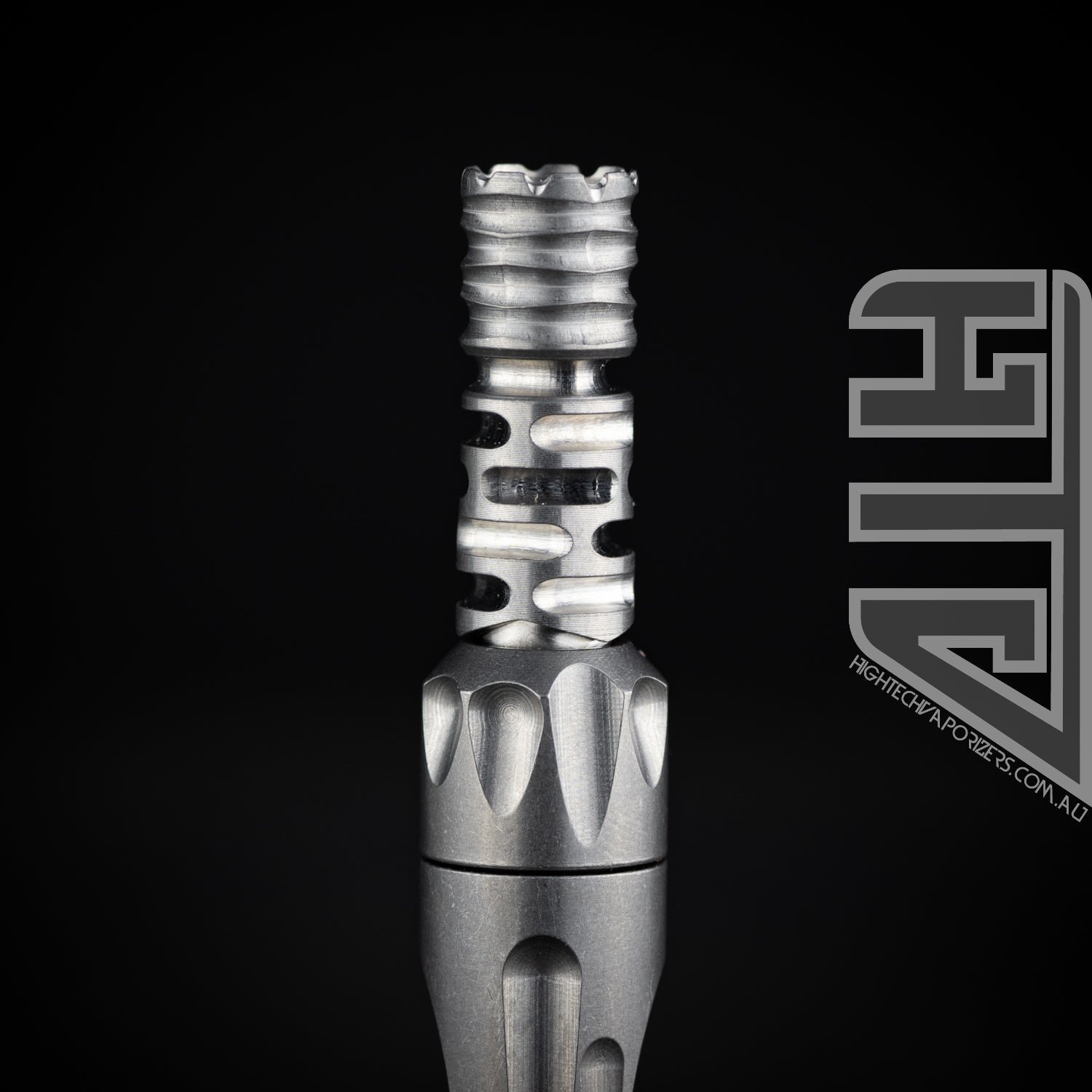 Moving on to the tip. A Nona notched completely contoured extraction chamber that doubles as a built in grinder sits atop a trisected 5 fin profile. Contained inside the extraction chamber is our two position Adjust-a-Bowl feature that allows you to adjust the size of the dosing chamber to your needs.